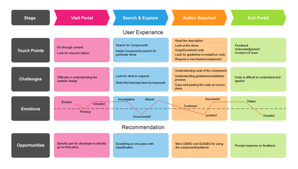 User journey map developed to uncover the pain points as well as explore opportunities to make improvements.
